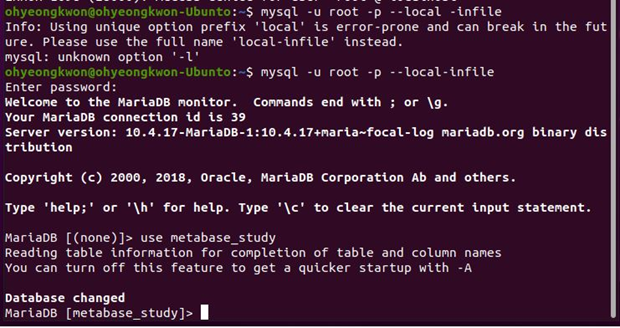 Maria DB 실행 시 CSV 파일로 Data Import 시에는 --local -infile을 명령어에 추가함
